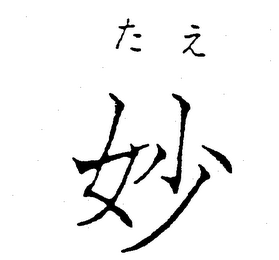 THE ENGLISH TRANSLATION OF THE LOWER CHARACTERS IN THE MARK, WHICH ARE KANJI CHARACTERS, IS "MYSTERIOUS". THE UPPER CHARACTERS HIRAKANA CHARACTERS FOR THE SAME WORD, AND ARE PRONOUNCED "TAE."