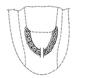 THE DRAWING CONSISTS OF A DOTTED OUTLINE OF A FRONT HALF OF AN ATHLETIC SHOE WHICH IS NOT PART OF THE MARK BUT MERELY SHOWS THE POSITION OF THE MARK WHICH IS A DESIGN OF A BRAID.