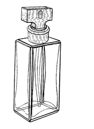 THE MARK IS THE CONFIGURATION OF AN ELEGANTLY DIMENSIONED GEOMETRIC ELONGATED HIGH CLARITY FLINT GLASS BOTTLE, WITH BEVELLED EDGES, AND HEAVY WALLED DISTRIBUTION. IT GIVES THE ILLUSION OF A BOTTLE WITHIN A BOTTLE, WITH SOFTLY CONTOURED SIDES, AND THE FRAGRANCE FREE FLOATING IN THE INNER BOTTLE CAVITY. IT IS CAPPED WITH A SQUARED-OFF SILVER COLORED STOPPER.