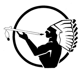 The mark consists of a design comprising the encircled profile of an American Indian Chieftain wearing a feathered war bonnet and smoking a peace pipe.
