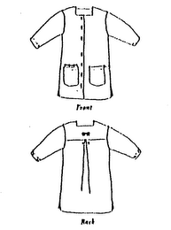 The mark consists of a one size smock of a length sufficient to reach the knee of the average person, a full opening in front securely closed by seven buttons, a button on each sleeve forming a pleat when fastened, two large patch pockets, on either side of the front opening, on one side a third pocket tucked into the patch pocket and on the other side a loop adjacent to the pocket for storing tools, a square neckline, a box pleated back, a loop in back for hanging the garment, and an outside "GIANNA ROSE" label centered on the back yoke.
