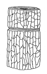 The mark consists of the configuration of a cylindrical shaped bottle (glass or plastic) encased in a cylindrical shaped wooden limb or branch of a tree, such that the bark of the tree is exposed, and a cylindrical matching wooden cap; the lining in the mark is a feature of the mark depicting the growth rings of the tree.