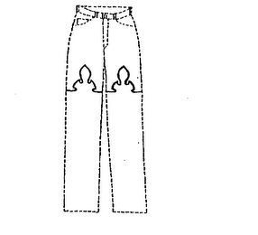 The mark consists of a stylized design applied to the knee portion of pants. The dotted lines are not part of the mark and serve only to show the position of the mark on the goods.