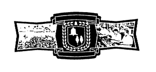 The mark consists of a stylized drawing of a bell and two stylized leafs containing in the center of a leaf a emblem, which are super-imposed over a depiction of a tobacco field and workers rolling cigars.