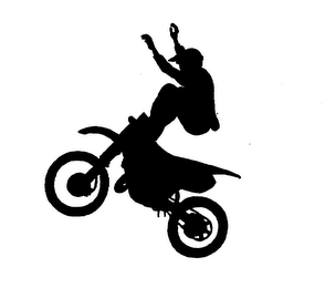 The design consists of a silhouette of an individual standing, with knees bent, on the handlebars of a motorcycle.