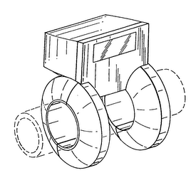 The mark consists of a configuration of a portion of an ultrasonic flowmeter, namely, a roughly rectangular electronic unit mounted on the meter body, in the form of cylindrical spool pieces that house the transducers and the electronics. The material shown in dotted lines serves to show the position of the mark on a pipe and is not claimed as part of the mark.