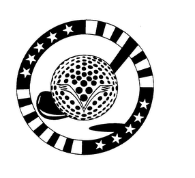 The mark consists of a golf ball on a dark green golf club placed in a light green circle. The shading of the ball within the circle is reflected in dark green. The outer right portion of the circle is blue with blue stripes, the outer left portion of the circle is red with red stripes. The "V" logo on the golf ball is yellow.