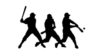 The drawing shows a silhouette of a baseball player swinging at and striking a ball in three successive figures