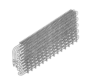 The mark consists of an assembly configuration of a heat exchanger evaporator for air conditioning and refrigerator applications, namely, the combination of a one piece serpentine tube inserted through slots in multiple, thinly constructed fins that are closely and uniformly spaced. The downward tilting end portion of the serpentine tube is not claimed as part of the mark.