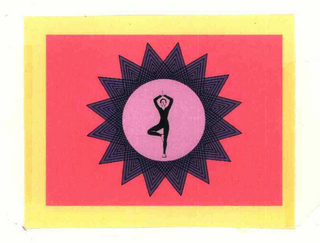 The drawing is depicted in color, with the background rectangle in pink, the circular/starburst design in blue with black lines, the round central circle in lighter pink and the standing character in black. The yellow color is intended as background and is not part of the mark. Color is claimed as a feature of the mark.