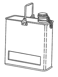 The mark is a rectangular-shaped metal container whose height is greater than its width and whose width is in turn greater than its depth. There is a small diameter metal carrying handle which is movably attached to both of the greater rectangular sides of the container at their mid-point. Finally there is a screw-cap type closure fitted with a safety chain which is disposed on the front-top of the container