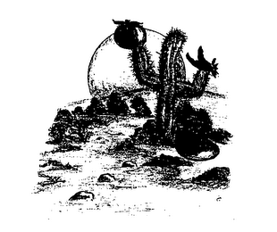 a stream with several small steppingstones in it. On the banks of the stream there are bushes and some grass patches along with one large cactus. On the end of one arm of the cactus there is a tomato and on the other there are two chilli peppers. At the base of the cactus there is a sombrero. Behind the cactus there are bushes and a small hill with a setting sun.