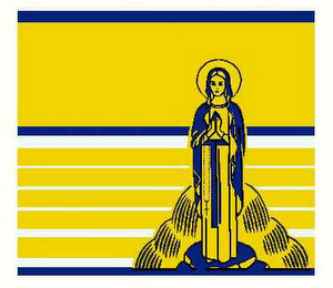 The mark comprises a figure of the virgin of Lourdes on a pedestal in front of a fountain with yellow horizontally striped background with blue highlights. The color yellow appears in the horizontal background stripes, in portions of the virgin figure, the fountain, and the virgin's pedestal. The color blue appears in horizontal background accent lines, the margin, the pedestal, the virgin's wrap and sash, her halo, outlines of her dress, and the fountain accent lines.