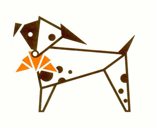 The dog's ears, tail, right side of its head, left eye and spots on its body and leg are brown. The croissant design that appears under the dog's chin is orange. The dog's left side of its head, right eye, nose and remaining portion of its body and legs are white.