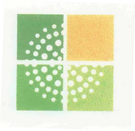 The mark is a square divided into four quarters. The upper right quarter is an orange-yellow, Pantone 108U; the lower right quarter is a pale yellowish-green, Pantone 372U; the lower left quarter is a light yellowish-green Pantone 382U; and the upper left quarter is a dark yellowish green, Pantone 376U. The lower right, lower left and upper left quarters have five (5) concentric, arcuate arrays of circular white areas, the areas of the center array circles are largest; the areas of the adjacent array circles are smaller; and the areas of the inner and outer array circles are smallest.