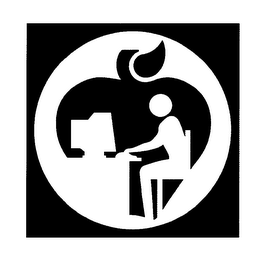 The background square is blue; the circle, human figure, computer and equipment, and chair silhouettes are white; the apple silhouette is red, and the leaf silhouette is green.