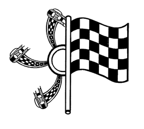 The mark consists of a checkered-flag-and-flag-pole graphic design adjacent to a graphic rendition of a portion of a ceiling fan that includes three fan blades with a checkered pattern and a model vehicle on each of the fan blades; the uniformly spaced-apart horizontal lines in the drawing are for shading purposes only and they are not part of the mark.
