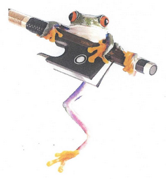 The mark consists of a frog perched on top of a bow for playing musical instruments. A purple and white leg extends below the middle of the bow. There is an orange foot attached to the bottom of the purple and white leg. The color orange appears in the frog design and in the foot at the bottom of the mark. The color green appears in the frog design. The color white appears in the frog design, in the bow design, and in the leg design at the bottom of the mark. The color brown appears in the frog design and in the bow design. The color black appears in the frog's eyes and the bow design. The color silver appears in the frog's eyes and the bow design. The color silver appears in the bow design. The color purple appears in the leg design at the bottom of the mark.