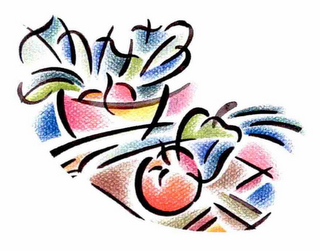 The mark consists of the design of a bowl of fruits and vegetables behind the design of tomato and pepper placed on a table; the color black appears in the outline of the elements in the design; the color white appears in the background; the color red appears in the table, the bowl and the fruit in the bowl and part of the tomato design; the color orange appears in the tomato, the fruit in the bowl and in the table; the color yellow appears in the bowl; the color blue appears in the leaves in the bowl, the bottom half of the pepper, the table and the background next to the bowl; the color green appears in the top half of the pepper, in the leaves in the bowl and in the table; the color brown appears in the table design.