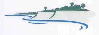 The mark consists of green palm trees and hills atop beige cliffs. Below the cliffs are blue waves.