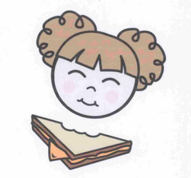 The mark consists of the following: a stylized representation of a smiling girl with a light pink face, round pink dimples/ cheeks, and brown hair with two hair ties, a partially eaten, diagonally cut, sandwich with tan bread having dark brown crust with yellow filing and a portion of a yellow cheese slice protruding from the sandwich, and black lines accenting and separating the features.