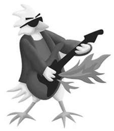 The mark consists of the design of an anthropomorphic chicken playing a guitar from which flames are emitted.