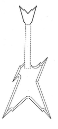 The mark consists of a fanciful design of a guitar including a body having an outer beveled surface or razor like edges with sharp points and angles, and an inverted arrow-shaped headstock with an outer beveled surface or razor like edges with sharp points and angles having a jagged V at the top of the headstock. The matter shown in broken lines is not part of the mark and serves only to show the position or placement of the mark.