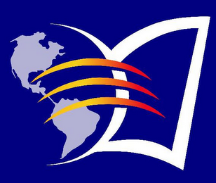 The mark consists of a styled image of an open book outlined in white on a dark blue background with an image of the northern and southern hemisphere in light blue on the left page. Three curved lines each appearing in a spectrum from yellow to orange to red join the left page to the right page of the book.