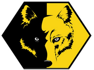 The mark consists of a black framed hexagon featuring a wolf's face. Half of the image is yellow and half of the image is black. On the black half the ear and face are highlighted in yellow. On the black half the ears and face are highlighted in black. The eyes are white and black.