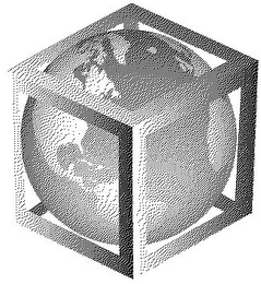 The mark consists of a globe enclosed in an open-sided box/cube. The cube fades in from left to right. The lines defining the borders of the open Box will touch the Globe on all sides. The globe is positioned to show North and South America in the left panel of the cube with part of Europe (including the British Isles) and part of the Mediterranean Sea displayed in the top panel of the cube. The north western portion of the African continent is displayed in the far right panel of the cube. Greenland and Iceland are to be positioned to the right and left of the center line at the upper apex of the globe.