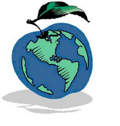 The mark consists of the color blue is the background of an apple that resembles a world map. The continents appear in green, with the details and outlines of the continents appearing in black. The apple has a black stem with a green and black leaf. The color gray appears in the shadow below the apple.