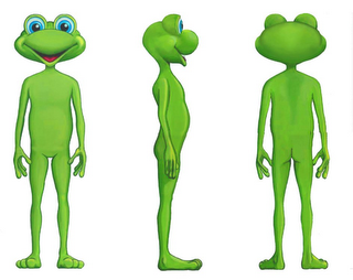 The mark consists of front, side and back view of a frog standing erect on the feet. The color green appears in the body of the three frogs, the colors white, blue and black appear the eyes of the two frogs, the color black appears in the mouth of the frog, and the color red appears in the frog's tongue.