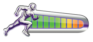 The mark consists of a design of a gray, black and purple man in running motion next to a color graph that is outlined in gray and black and contains the colors, from left to right, dark green, green, light green, yellow, light orange and dark orange, and with each of those colors separated by blue.