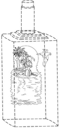 The mark consists of two elements of a label for a bottle for the goods. A first element, comprised of a pirate holding a sword in his right hand with his left leg propped on top of a barrel on an island with two palm trees appears behind the second element, comprised of a parrot flying overhead with a transparent material there between so that the first and second elements are visible at the same time.