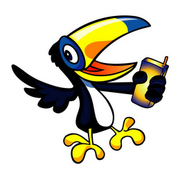 The mark consists of a stylized bird, appearing to smile, in profile, outlined in black, with wings outstretched, holding a small beverage container. The upper flange of the bird's long yellow open beak has a medium blue tip, as well as a small orange tear-shaped mark, half the height of the beak flange, that begins about halfway and ends one quarter of the way between the beak tip and mouth corner. The top flange has a white highlight streak with a height of about one-fifth the flange height; the length of the streak begins one-thirty-second of the beak flange (at its widest point, near the eye), and continues narrowing to a point that ends seven-eighths of the length of the flange (at its narrowest point, the tip). The bottom beak flange is yellow; the exposed inside of the bird's mouth is orange with a red "tongue." The iris of the bird's oval eye is dark blue, outlined in black, with a solid white highlight dot at its center. The oval white of the bird's eye is outlined in black. The eye is centered in an asymmetrical oval, outlined in black; most of this oval is medium blue, except for a dark blue arc on its right half, which begins at the topmost point of the oval, meets the rightmost point of the outline of the eye white, and continues to curve down and to the left until it meets the leftmost edge of the lower beak flange outline. The bird has stylized wings with four "feathers"; the wing at the left of the drawing is extended, with black feathers, and the wing at the right of the drawing, while also extended, shows the feathers as three "fingers" and a "thumb" wrapped around a stylized juice box. Both wings are dark blue, heavily outlined in black. The juice box has an orange straw. Its wide display panel consists of a radial gradient, white at the center, with concentric gradient shades of yellow, orange, and medium blue. The top panel is a horizontal gradient band, white at the center, with gradient shades of yellow, orange, and medium blue extending to both the left and right edges. The rightmost panel of the juice box has a medium blue and orange gradient in the small bottom section appearing below the bird's "fingers," and three triangles, the outer two yellow, the inner (inverted) one medium blue. The bird's head, all black, has three small bumps representing crests on its left edge. The body is heavily outlined in black. The back (left) half of the body is black, with an elongated dark blue tear shape in its bulbous lower half; the front of the body is mostly white, with a strip of medium blue, the width of the widest part of the lower beak flange, at the top, approximately where the bird's neck would be. The bird has two narrow stylized legs, yellow outlined in black, ending in two stylized feet with bulbous claws (yellow with orange highlights on their outer edges).
