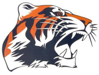 The mark consists of growling tiger head colored orange and white, with black stripes.