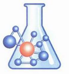 The beaker is made up of various shades of blue which fade to white; the beaker has a white stripe down the right-hand side; the larger center circle of "atom/molecule" design is made up of various shades of orange which fade to white; the smaller outer circles of the "atom/molecule" design are made up of various shades of blue which fade to white; the lines connecting the circles are made up of various shades of blue.