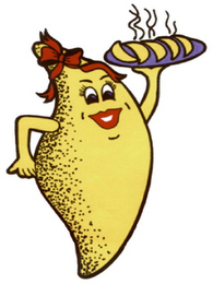 The mark consists of A CARICATURE OF A BODY SHAPED LIKE A EMPANADA AND SHE IS CARRYING A PLATE OF EMPANADAS. THE BODY AND ARMS OF THE EMPANADA CHARACTER AND THE EMPANADAS ON THE PLATE ARE YELLOW, THE MOUTH AND RIBBON ARE RED,THE PLATE IS BLUE AND THE EYES ARE BLACK AND WHITE .