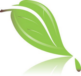 The mark consists of a green leaf (the "First Leaf") with white veining and highlighting flowing downwards with a drop of green water dropping off the tip of the First Leaf. Also, the tip of the First Leaf is joined by the tip of another leaf that appears to be a lighter reflection of the First Leaf, and is a lighter green color. The brown color is slightly noticeable at the bottom of the waterdrop and on the outermost point of the stem of the First Leaf.