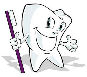 The mark consists of a stylized tooth with human characteristics holding a toothbrush, wherein the tooth is light blue, black and white and the toothbrush is light blue, black and white with a purple handle. The shadow of the tooth and toothbrush appears in gray on the bottom of the mark.