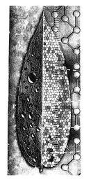 The mark consists of an image of a leaf on a background wherein the picture is split in half vertically; on one side of the picture, the leaf is textured and has water droplets in various places on the leaf and the background has a slight marbled effect; on the other side of the picture, the leaf has a mosaic pattern, similar to molecular cells, and the background has a pattern similar to chemical bonds.