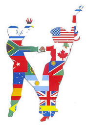 The color BLACK outlines the dancing figures, and appears in the right shoulder of the male and in the left hand of the male; the color WHITE appears in the head, arms and legs of the male and appears in the head, legs, feet and arms of the female; the color RED appears in both legs of the female, the torso of the female, and in the head, hair, feet and arms of the female and the color RED appears in the left hand, torso and legs of the male; the color ORANGE appears in the legs of the man and in the torso and left hand of the female; the color YELLOW appears in both feet of the male and in the right shoulder, the left thumb and in the right leg of the male and the color YELLOW appears near the ankles of the female; the color GREEN appears in the right shoulder of the male, the right arm, the right hand, the left foot and both legs of the male and the color GREEN appears in the left hip and the right underarm of the female; the color BLUE appears in the head, left arm, torso, legs and feet of the male and the color BLUE appears in the head, hair, right hand, torso and legs and feet of the female; the color LIGHT BLUE appears in the left leg of the male and in the right leg of the female; the color BROWN appears in the left hand of the male and the color BROWN appears in the right hand and torso of the female.