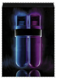 The mark consists of the front package design for the goods. The matter shown in the drawing by dotted lines is not a feature of the mark and no claim is made to it; it serves only to show the position of the mark. The color blue appears in the left vial, its shadow and its reflection; the color purple appears in the right vial, its shadow and its reflection; the color white appears in the outline of the vial caps, the vial shadows, the vial reflection and highlighting on the vials; the color black appears in the vials, the connecting band and the background of the mark; the color grey appears in the vials, the connecting band and the background.