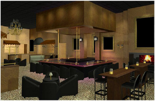 The mark consists of the appearance and interior design of an adult cabaret evoking the interior of a Victorian-era English gentlemen's club through the combination of: custom-designed tan and leopard print carpeting; brown marbleized and burled wood design achieved through multiple layers of wall paint; interior windows with brown awnings; entryway with rounded black awning; gold chandelier light fixtures; gold candelabra wall sconces with black shades; black lantern sconces with clear glass panels; center rectangular stage with black and dark brown stone surfaces and gold railings on top; black barrel-shaped chairs surrounding round black tables supporting gold table lamps with white lamp shades; black bar stools with rounded backs surrounding dark brown wood pub tables supporting miniature gold lamps with clear glass globes; and large, gold and ornate picture frames displayed on the walls. The recessed button-tufted seating booth is not exclusively claimed as a feature of the mark.