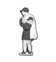 The mark consists of a man wearing a hat, glasses, tunic with a belt, socks and shoes; and is holding a cast net.