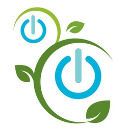 The mark consists of a stylized power icon with a partial circle in the color blue with a vertical line in light blue and a semicircular vine with leaves thereabout in dark green with a second smaller stylized power icon to the upper left of the first power icon with a partial circle in the color blue with a vertical line in light blue and a light green semicircle thereabout with a leaf to the right thereof in the color medium green.