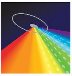 The mark consists of a gray oval surrounding a gray spot from which a fan of red, orange, yellow, green, blue and purple rays extend downward and to the side, some of the rays having a center line of gray spots, all on a dark blue background.