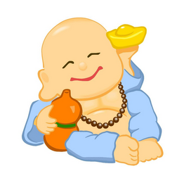 The mark consists of a tan, smiling Buddha like figure with red lips and black eyes, holding an orange and green calabash in the right hand and yellow Chinese ingots, a symbol of wealth and fortune, in the left hand. The figure is wearing a string of black beads and blue clothing.