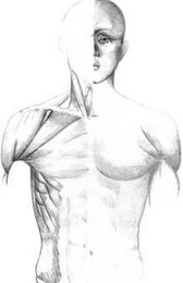 The mark consists of a drawing of a torso and head of a man showing only the left side of his face. Muscle tissue shoes through the skin on teh right side of the man's body.