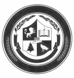 The mark consists of a seal with three concentric rings, the central ring being wider and shaded, mirror image sprigs of laurel in the shaded ring. In the upper part of the center space interior the rings are two further sprigs, above a crest in the center space divided into quadrants. The upper left shaded quadrant features a lion; an open book and flame in the upper right quadrant; an evergreen tree is in the shaded lower left quadrant; and a bird is in the lower right quadrant. In the center of the crest is a box with a ribbon over the box lower portion. In the box are two symmetrical symbols each comprising a central vertical line and two symmetrical inclined lines extending upwardly from the central vertical line forming inverted triangles. Below the crest in the interior space is a shaded ribbon forming a split ring with the two upper further sprigs.
